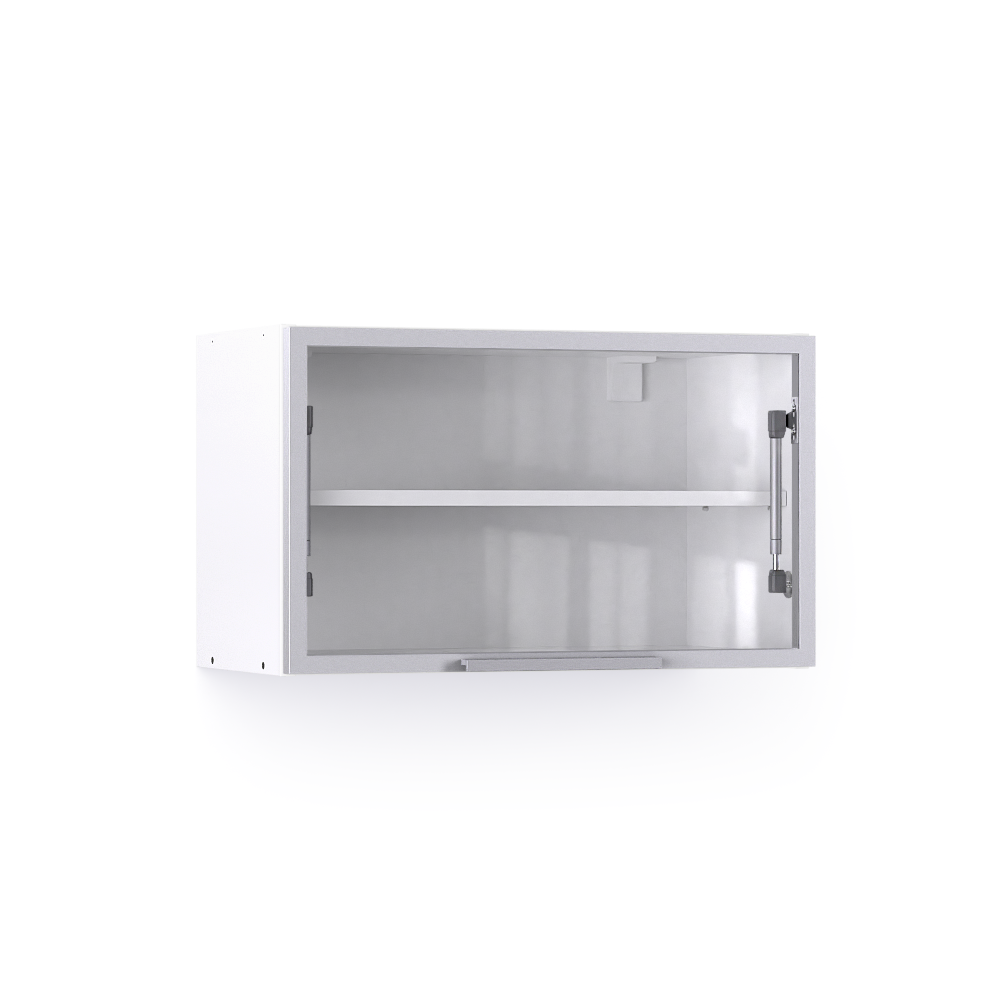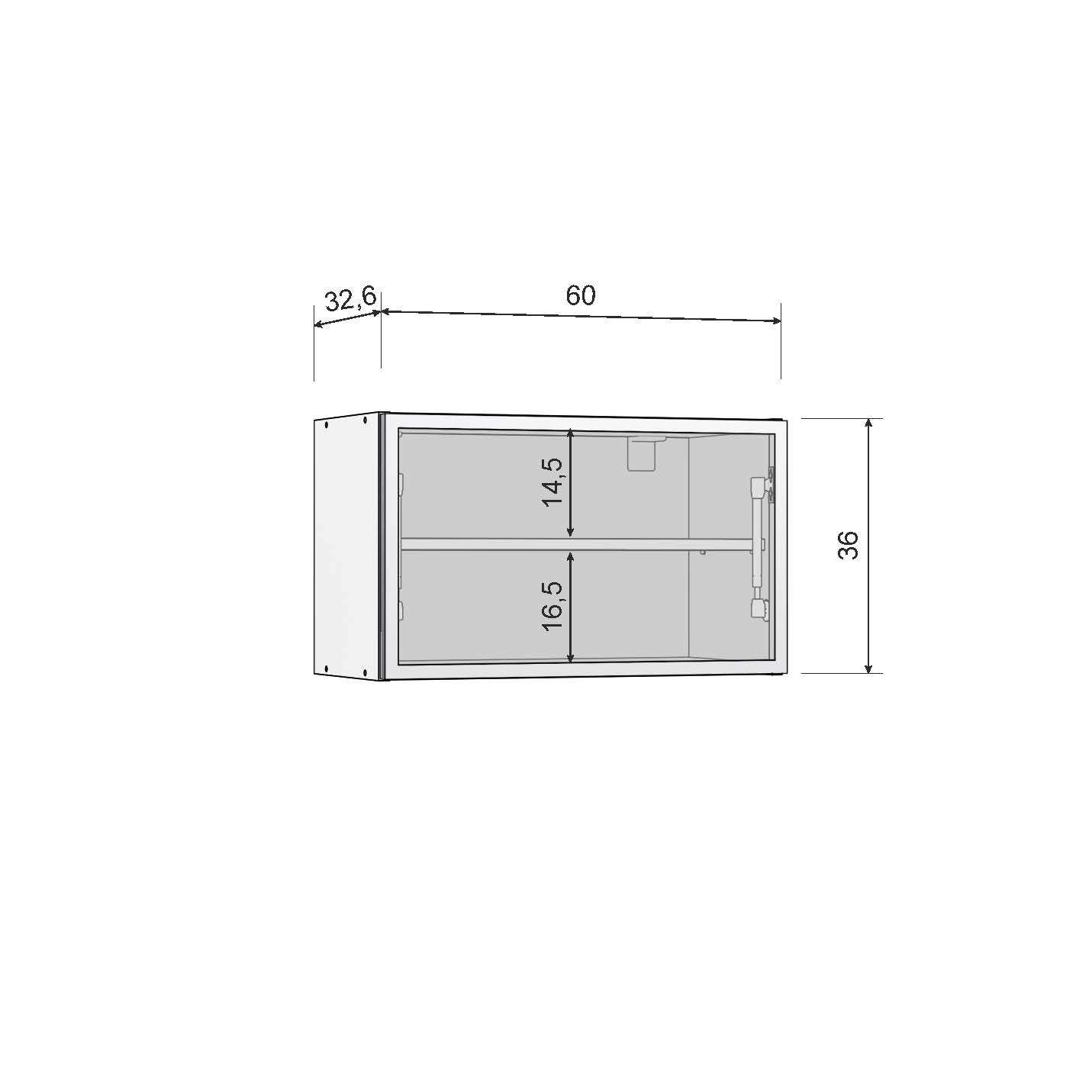 Horní skříňka výklopná šířka 60 cm, výška 36 cm. Nízká ale elegantní skříňka s hliníkovým rámem. Jemné linie skříňky jsou doplněny nenápadnou úchytkou. Doporučujeme doobjednat i skleněnou polici.