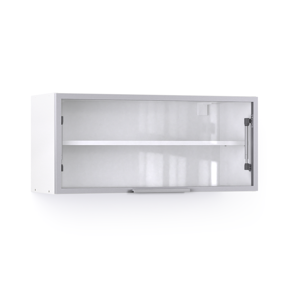 Horní skříňka výklopná šířka 80 cm, výška 36 cm. Nízká ale elegantní skříňka s hliníkovým rámem. Jemné linie skříňky jsou doplněny nenápadnou úchytkou. Doporučujeme doobjednat i skleněnou polici.