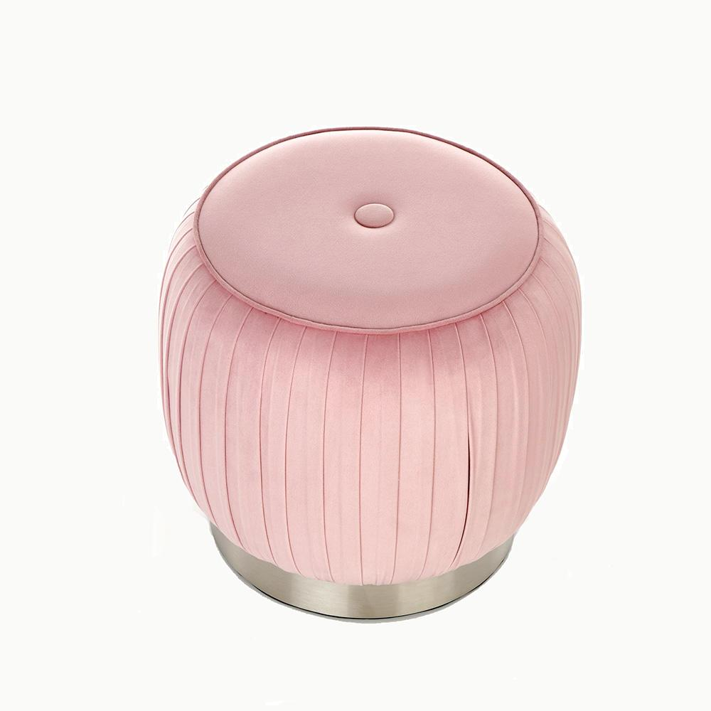 Taburetka z růžové velvet látky s kovovou stříbrnou podnoží, průměr 43×44 cm.
