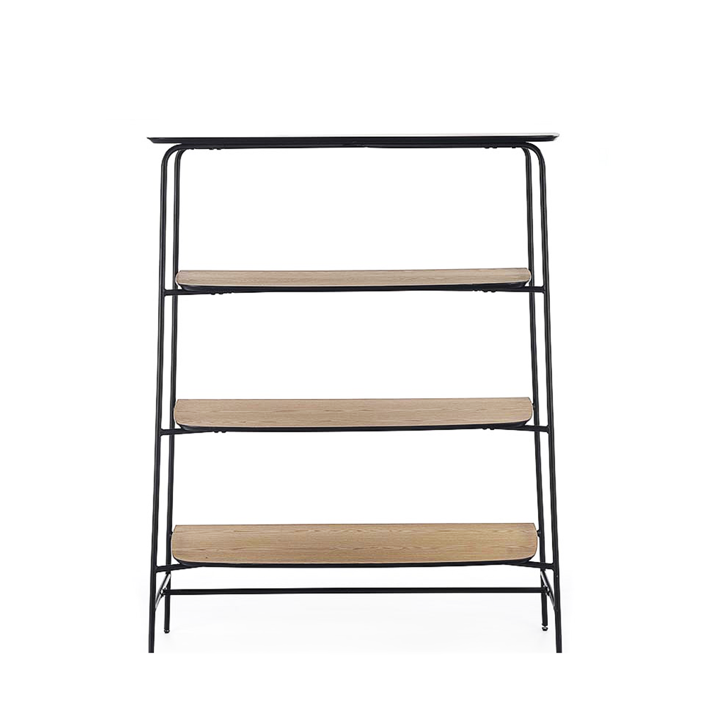 Regál s policemi z MDF a překližky s lakovanou povrchovou úpravou, kovová konstrukce černé barvy, barva polic šedá/přírodní, rozměr 140×110×40 cm.