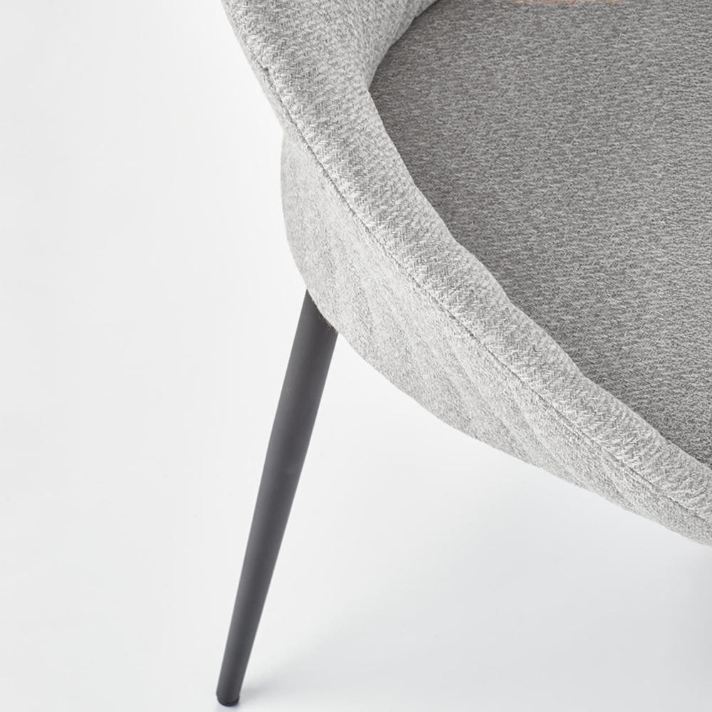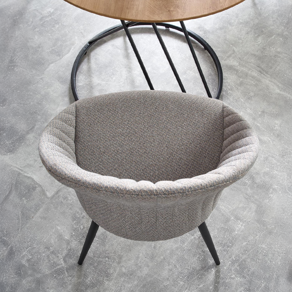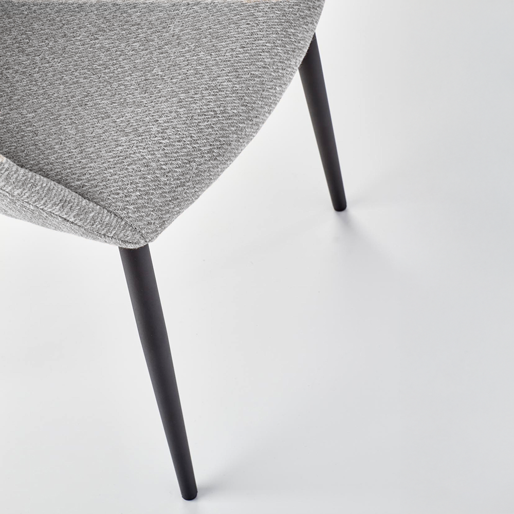 Jídelní židle s látkovým sedákem v šedé nebo béžové barvě a černými nohami. Dodáváno v demontu.