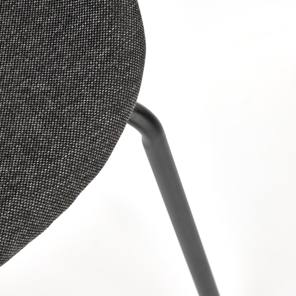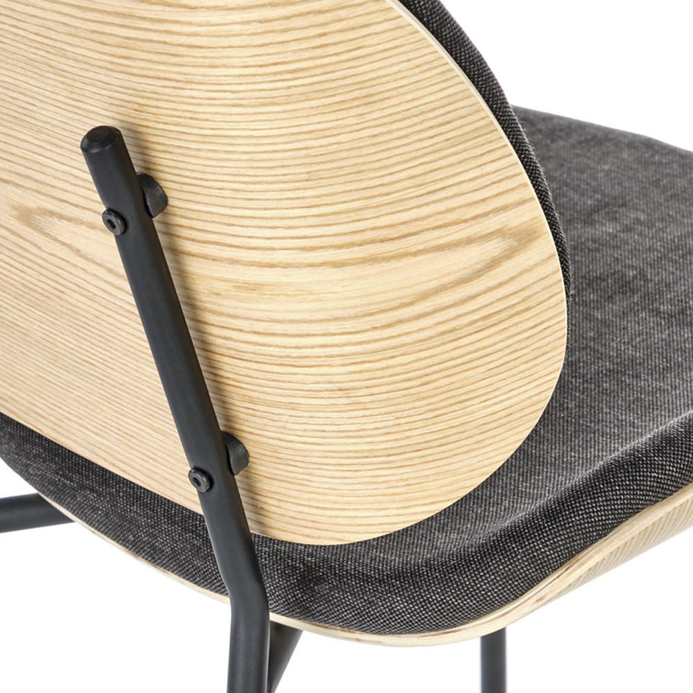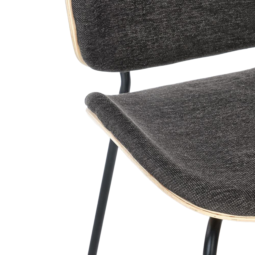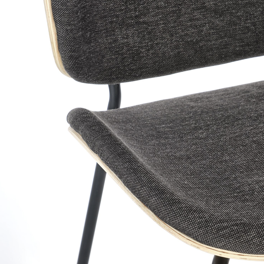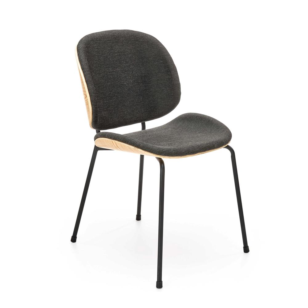 Jídelní židle s čalouněným sedákem i opěrkou, tvarovanou překližkou a kovovými nohami v tmavě šedé nebo černé barvě. Dodáváno v demontu, pouze do vyprodání zásob.
