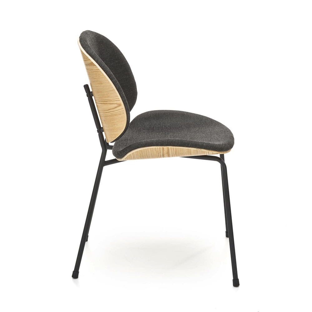Jídelní židle K467 spojuje stylový design s pohodlím. Sedák a opěrák jsou čalouněné, záda a základ židle jsou z tvarované překližky, nohy z kovu barveného černě zajišťují stabilitu a odolnost. Elegantní barevné provedení tmavě šedá / černá dodává židli nadčasový vzhled a hodí se do moderních interiérů.