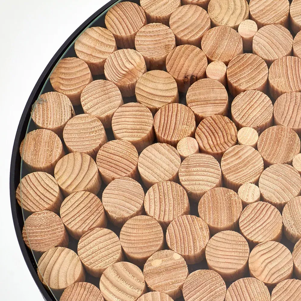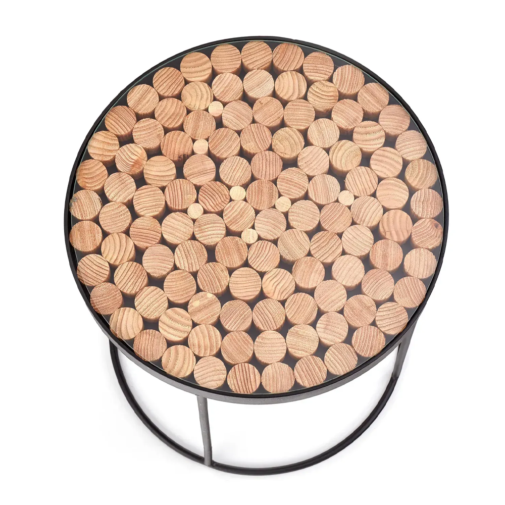 Sada dvou stolků se skleněnou deskou, smrkovým masivem a černými kovovými nohami, rozměr 59ר41 cm. Dodáváno v demontu.