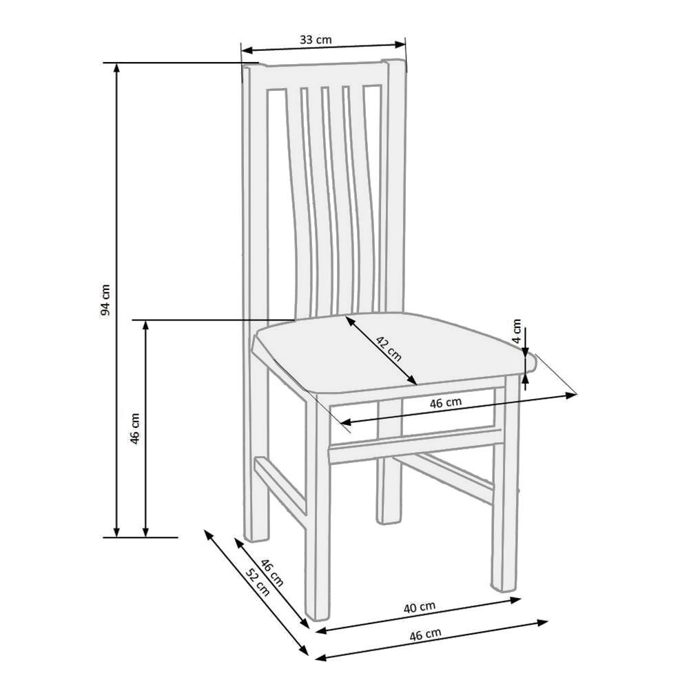 Dřevěná jídelní židle z bukového masivu s čalouněným sedákem, rozměr 46×52×94 cm. Dodáváno smontované, balení po 2 ks, pouze do vyprodání zásob.