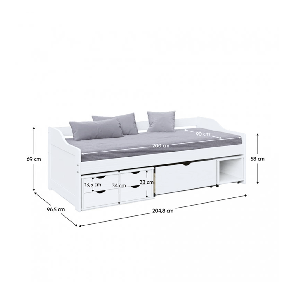 Jednolůžková postel Floro 90 je univerzálním řešením pro dětské a studentské pokoje. Je vyrobena z kombinace masivního dřeva a lakované MDF s viditelnou strukturou dřeva, v elegantním bílém lesku. Postel poskytuje komfortní spací plochu o rozměru 90 x 200 cm a dostatek úložného prostoru v podobě čtyř menších zásuvek a jedné velké zásuvky na kolečkách.