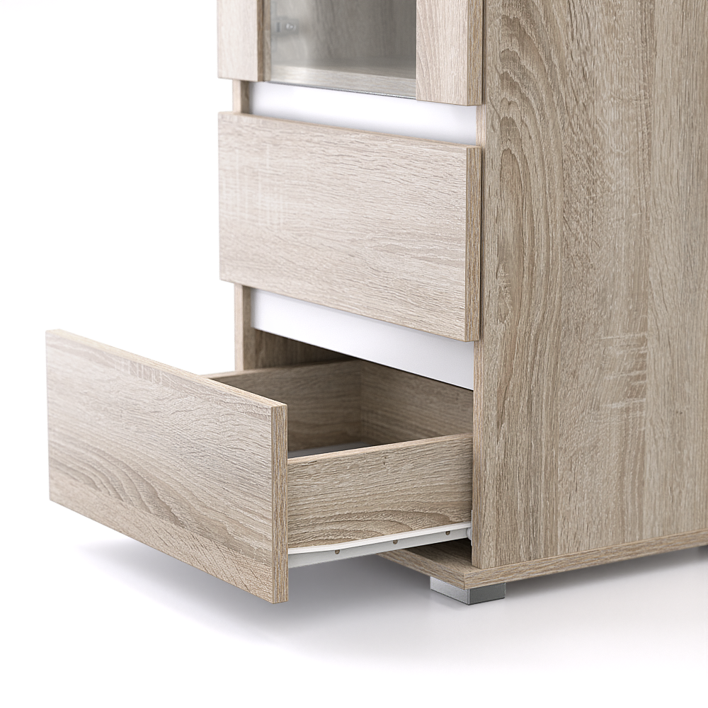 Tři skleněné police jsou součástí balení. Policová část má předvrtané díry pro umístění polic tak, abyste si mohli poličky umístit dle vlastní potřeby. Dekorační lišty nad zásuvky si můžete dokoupit v barevně odlišném dekoru než samotná vitrína. Můžete si zvolit jemnější nebo i barevně kontrastní vzhled. Nabízíme vám LED osvětlení poliček, kterým si zpříjemníte atmosféru v pokoji. Všechny skleněné části jsou z tvrzeného skla. Nožičky jsou vyrobeny z pevného plastu a jsou stříbrné barvy. Komoda je vyrobena z kvalitní laminované dřevotřískové desky tloušťky 16 mm s ABS hranou tloušťky 0,5 mm, vrchní deska je z pevné laminované dřevotřísky tloušťky 25 mm s kvalitní 2 mm ABS hranou. Na výběr máte krásné dekory komody a spoustu barevných provedení dekoračních lišt. Dodává se v demontu