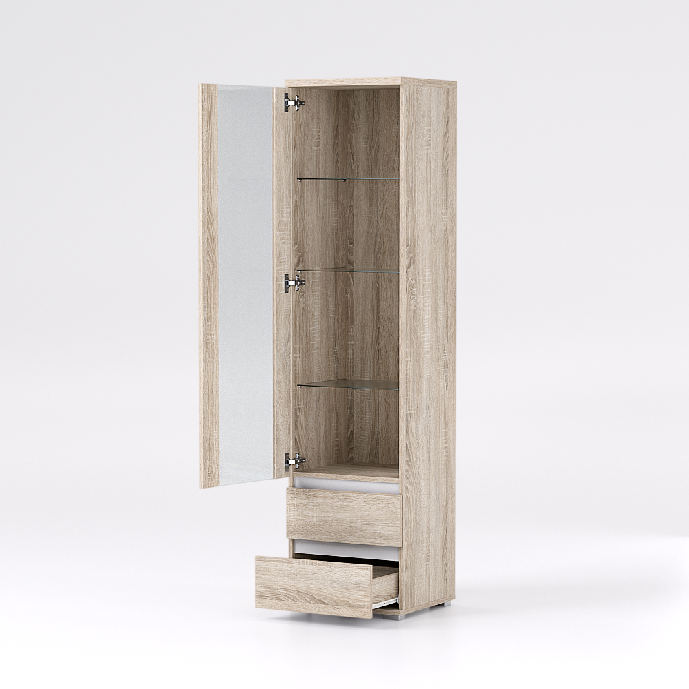 Vysoká vitrína se dvěma zásuvkami, skleněnými poličkami a dveřmi s možností dokoupení kontrastních lišt.