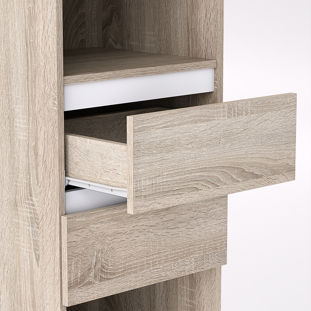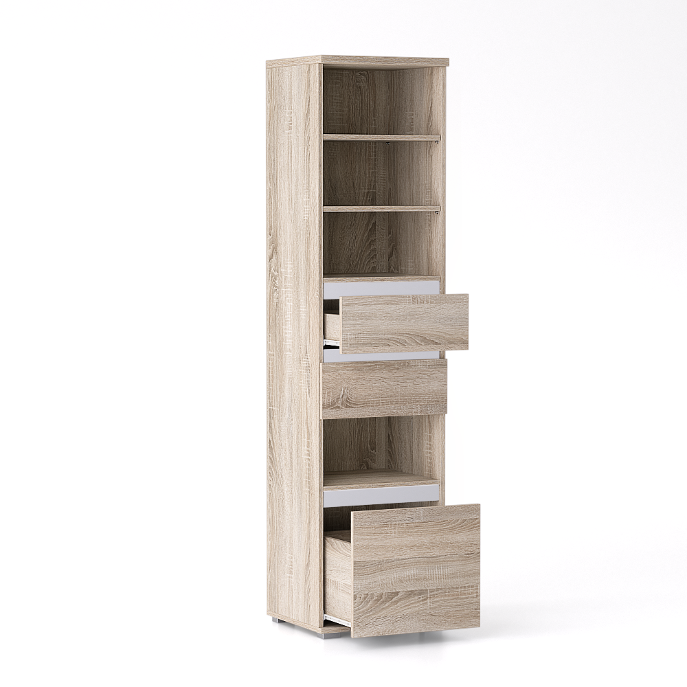Vysoká policová sestava se dvěma zásuvkami uprostřed regálu a velkým kontejnerem pro uložení objemnějších věcí umístěným na spodku regálu, vše v barvě dekoru regálu. K otevření zásuvek je použit jednoduchý kolejničkový výsuv. Jelikož regál má předvrtané otvory po celé výšce, dokoupit si můžete potřebný počet polic a to iv odlišném dekoru než je regál, pokud chcete barevně kontrastní vzhled. Lištu nad každou zásuvkou si rovněž můžete dokoupit v odlišném dekoru než regál. Regál si tak přizpůsobíte vlastním potřebám a fantazii.